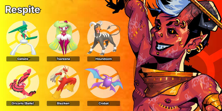 Respite is a tiefling bladesinger wizarder (or a dance bard in 5.5e, but I do prefer them as a bladesinger, maybe even with a rogue/swashbuckler dip) flavored as being a Scarlet Mummer. He fights pretty exclusively with fire, even possessing the Flames Of Phlegethos feat that allows him to manipulate it even more expertly. Naturally, his favored Pokémon type is Fire, though he also dabbles in Fighting.